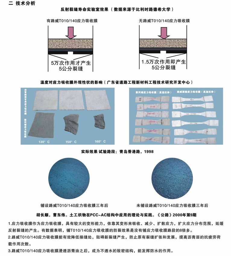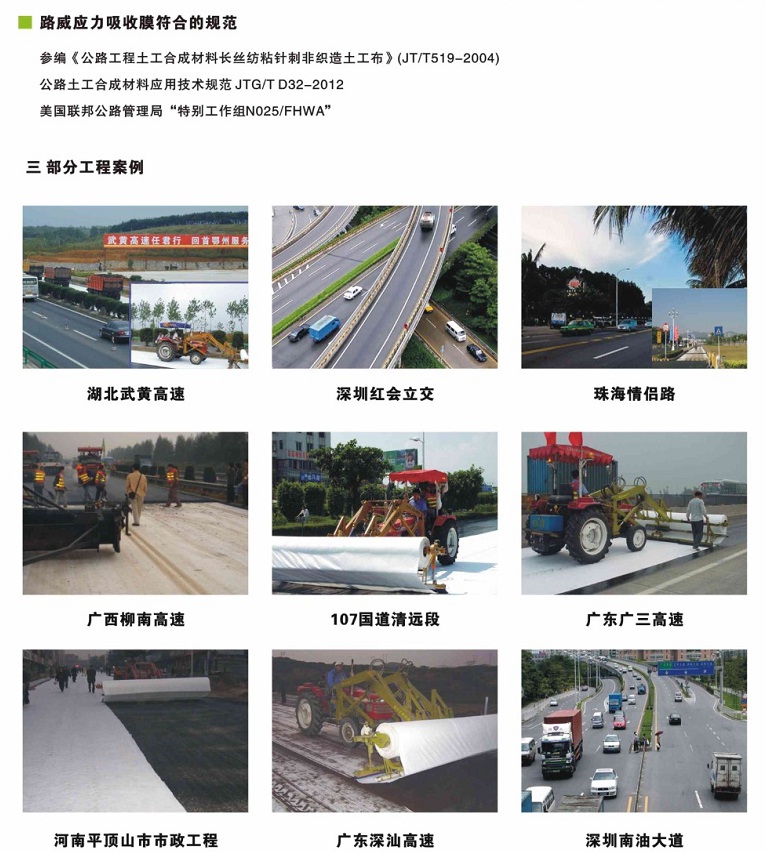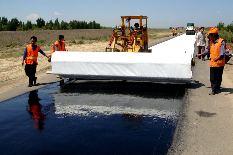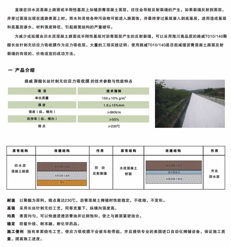 耐溫:以聚酯為原料,熔點高達230攝氏度,瀝青混凝土攤鋪時性能穩(wěn)定,不收縮,不變形;