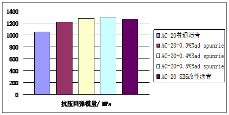 ???????瀝青混凝土的靜態(tài)回彈模量體現(xiàn)著道路的承載能力,靜態(tài)回彈模量越高,道路承載能力越強(qiáng),使用壽命也就越長(zhǎng)。按照《公路工程瀝青及瀝青混凝土試驗(yàn)規(guī)程》中方法對(duì)Rad spunrie復(fù)合高聚合物改性瀝青混凝土和普通瀝青混凝土的20℃靜態(tài)回彈模量進(jìn)行了對(duì)比試驗(yàn),如下表所示: