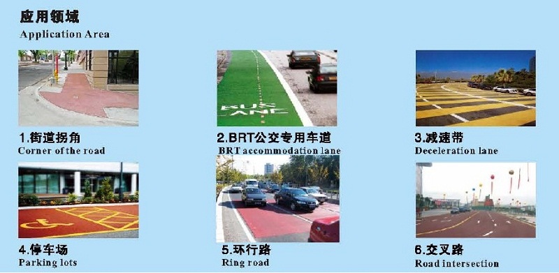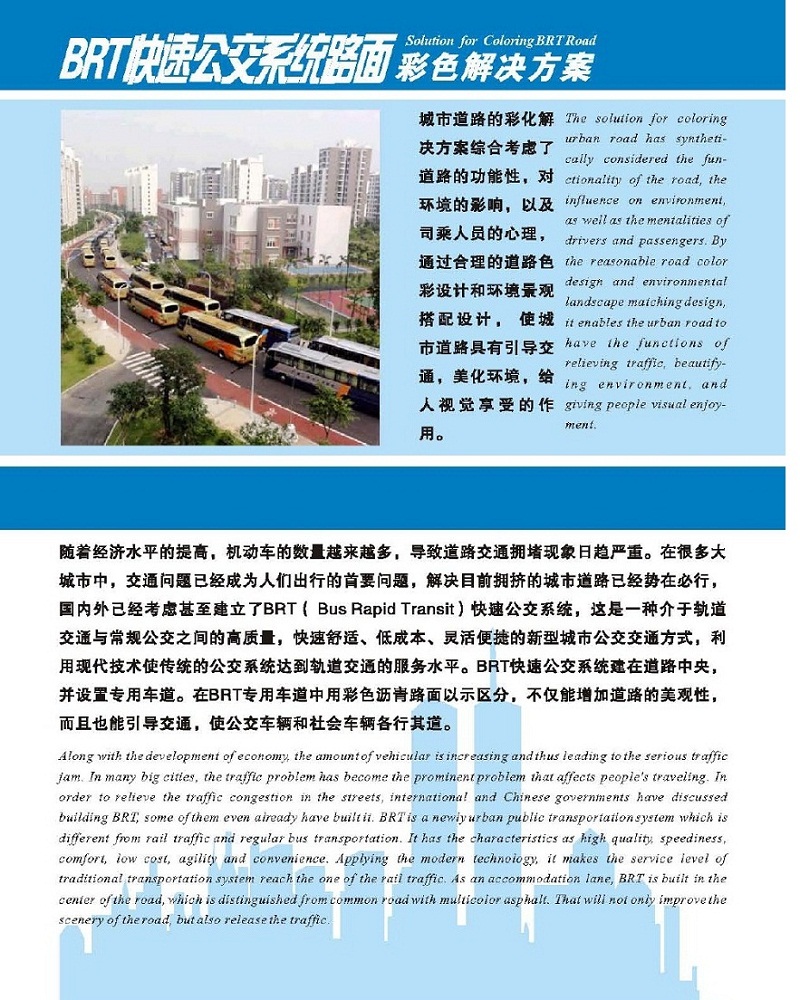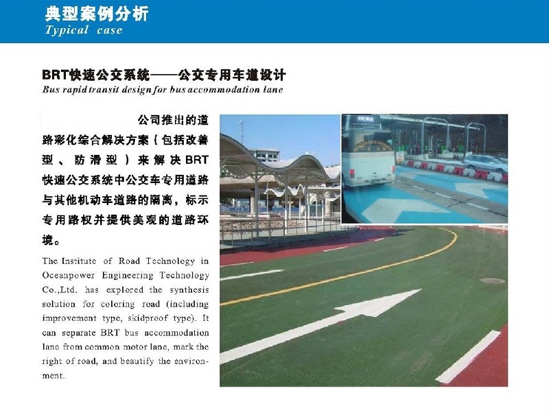 海川新材公司推出的道路彩化綜合解決方案(包括改善型、防滑型)來解決BRT快速公交系統(tǒng)中的公交專用道路與其它機動車道路的隔離,標示專用路權并提供美觀的道路環(huán)境。